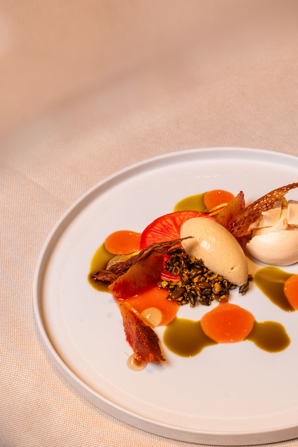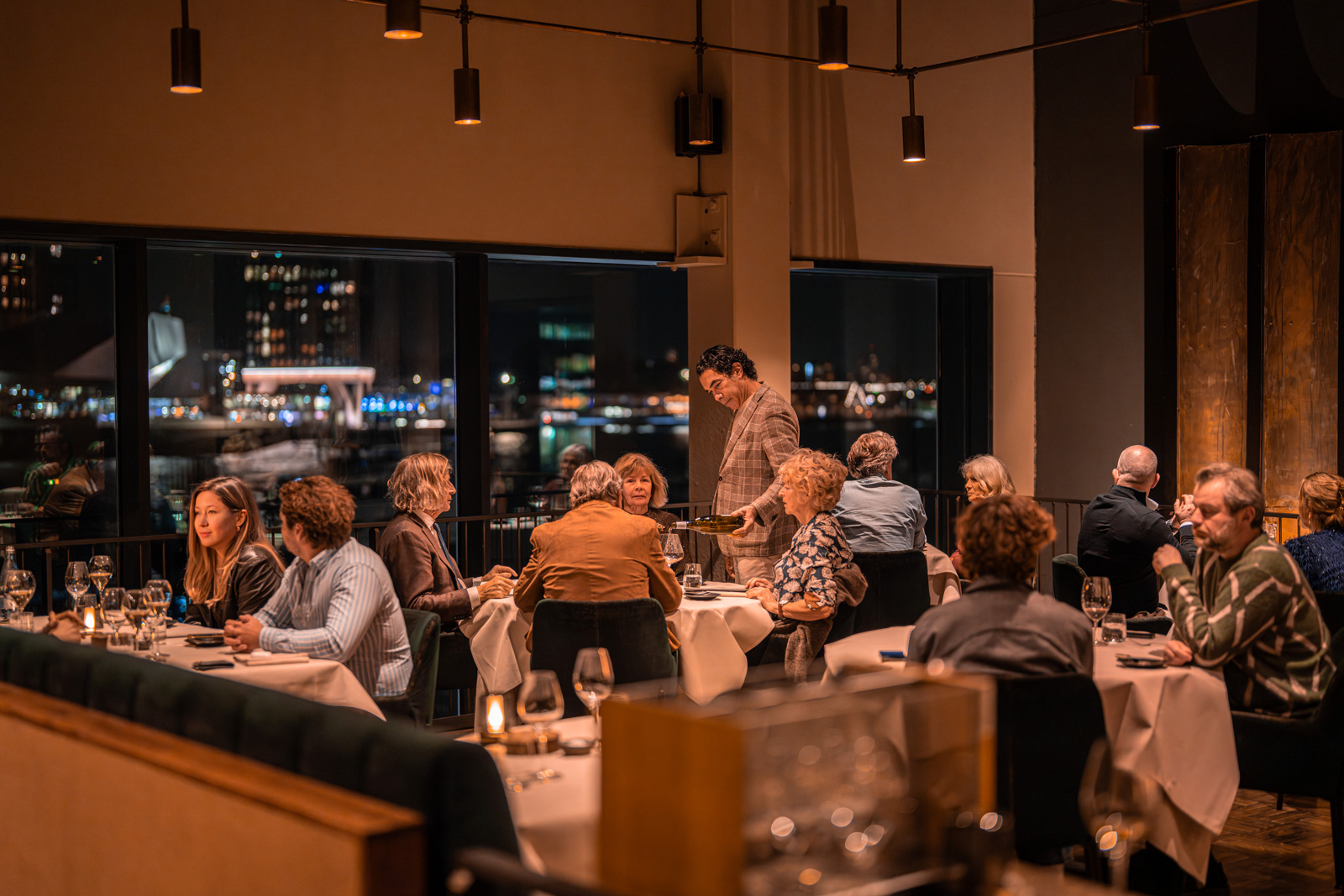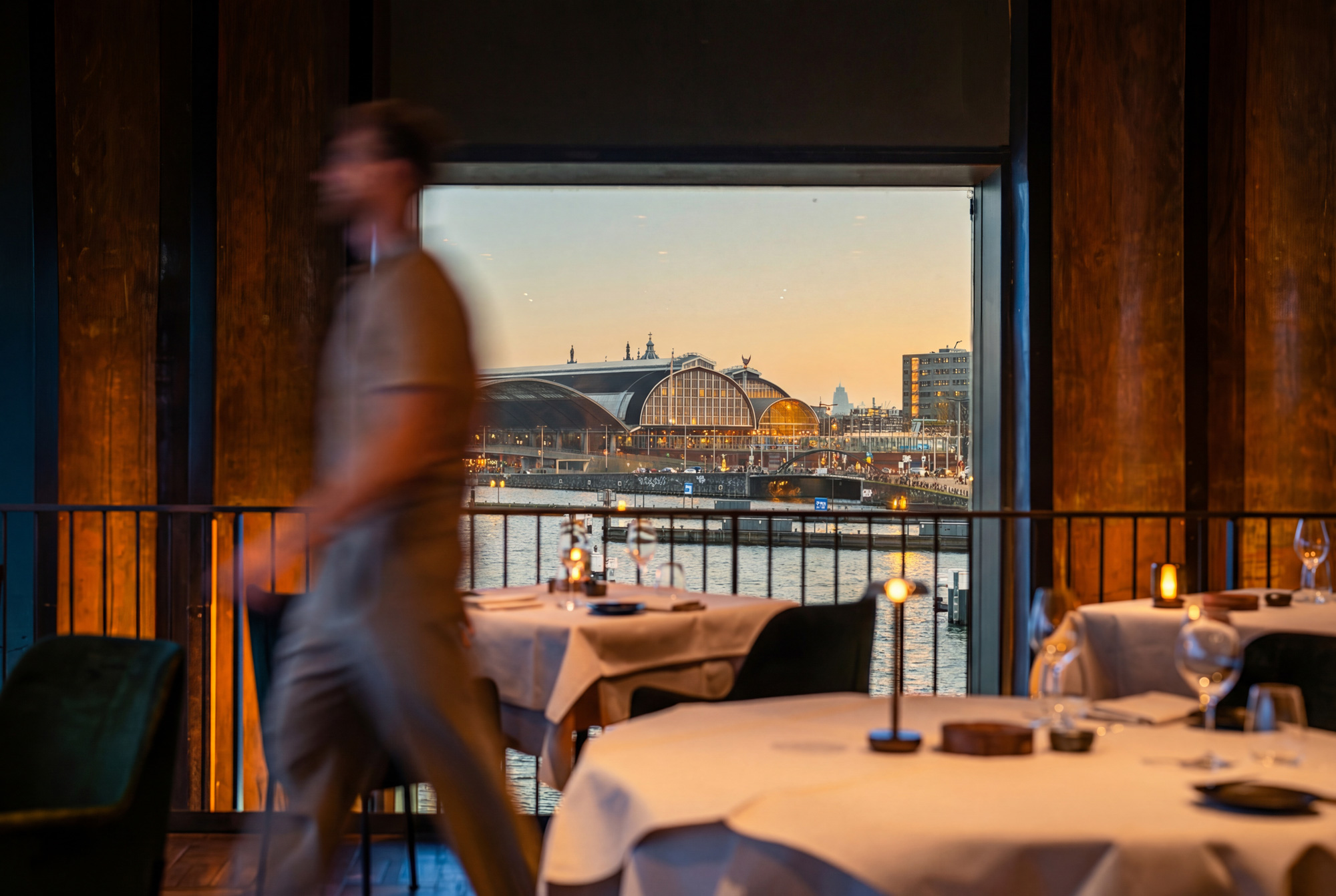 Op het uiterste puntje van het IJdok vindt u de rust die bij fine dining hoort. Panoramische ramen openen het uitzicht over water en stad, terwijl binnen aardse tinten, comfortabele stoelen en subtiele verlichting een warme, uitnodigende sfeer scheppen.