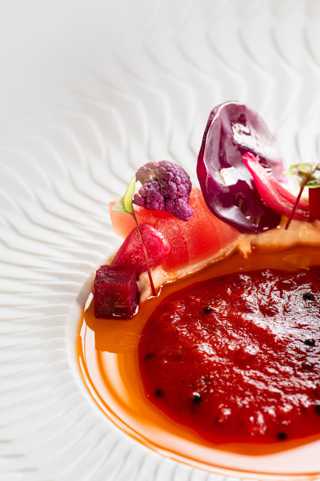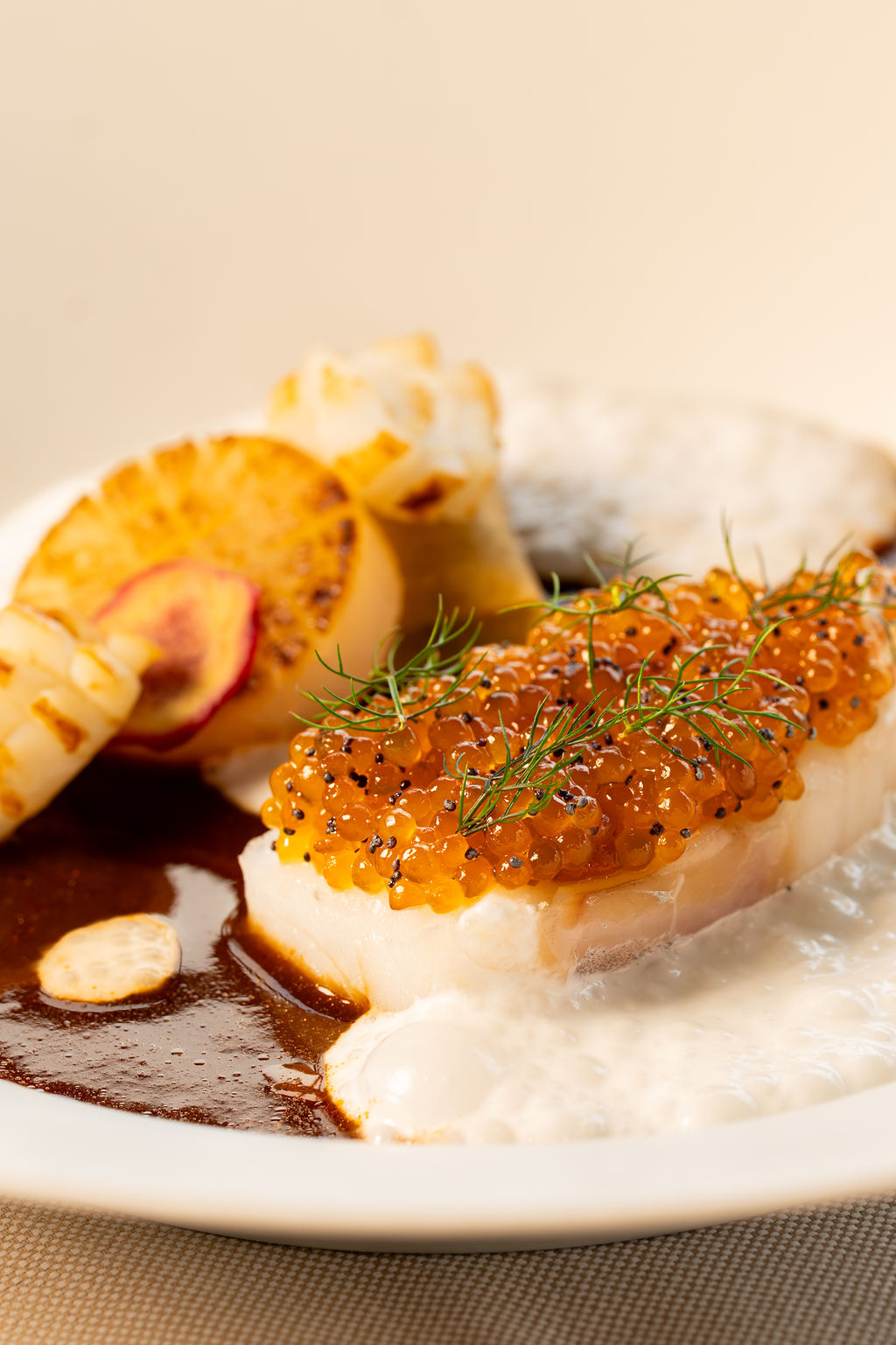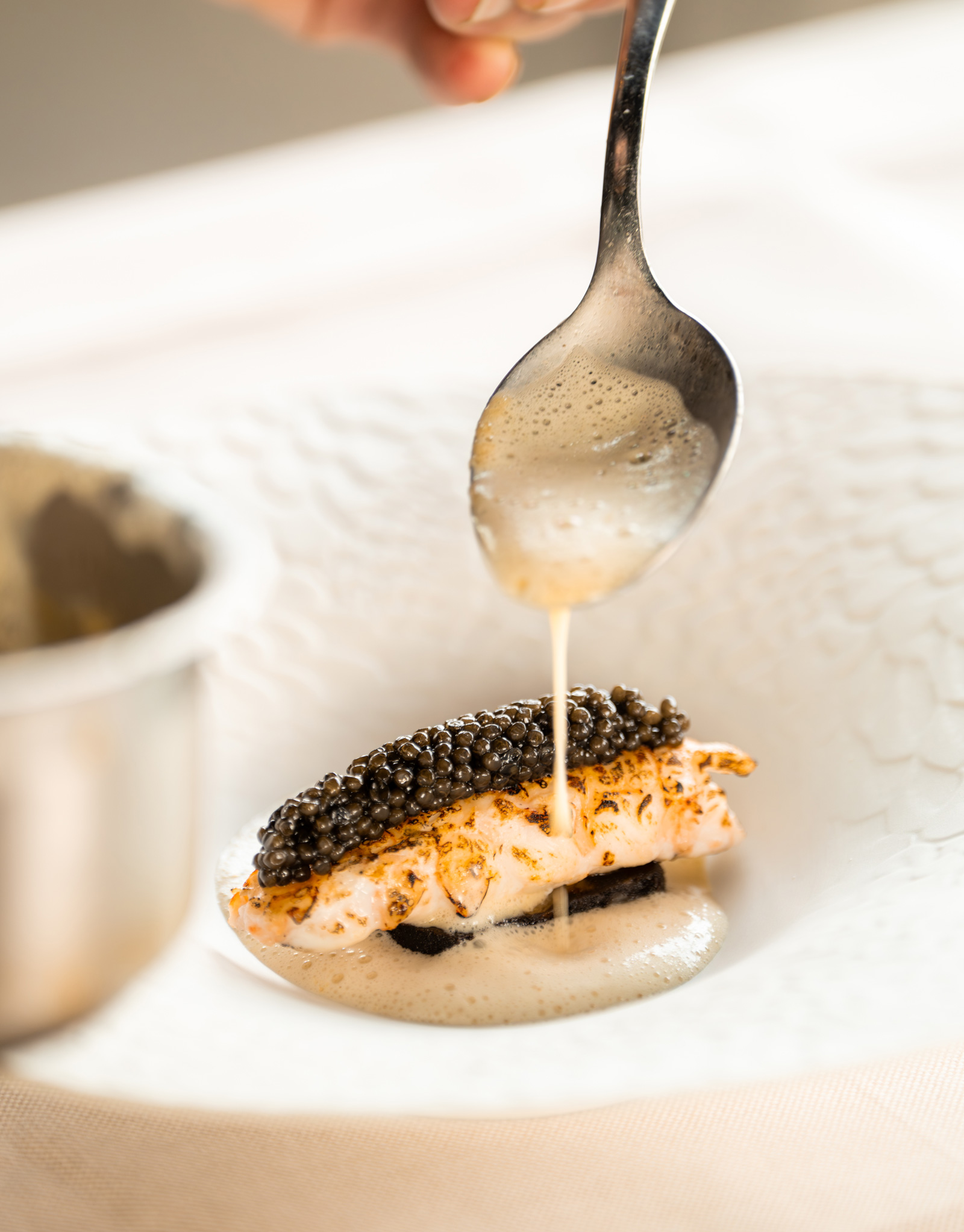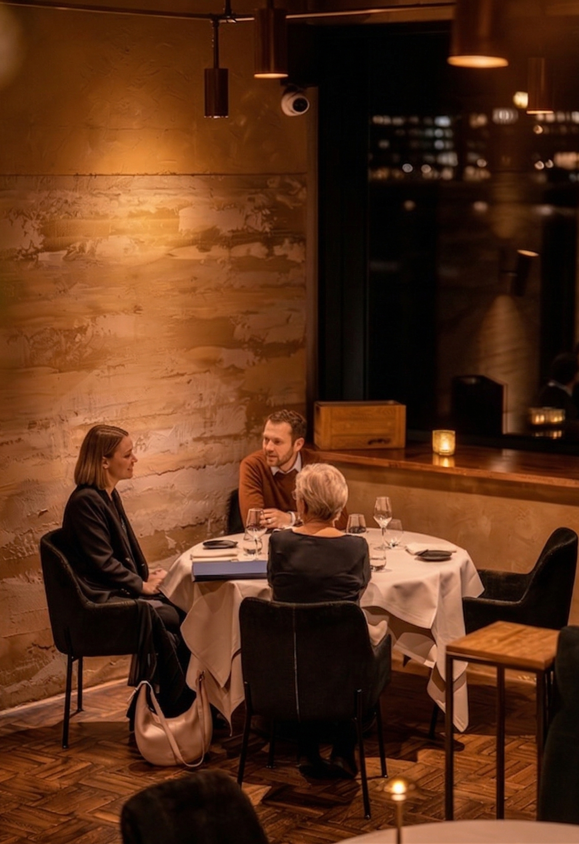 Op het uiterste puntje van het IJdok vindt u de rust die bij fine dining hoort. Panoramische ramen openen het uitzicht over water en stad, terwijl binnen aardse tinten, comfortabele stoelen en subtiele verlichting een warme, uitnodigende sfeer scheppen.